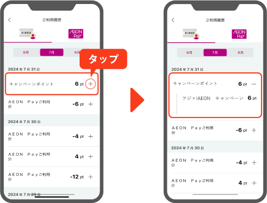 進呈されたポイントは、iAEONアプリホーム画面右下のマイページ>ポイント履歴よりご確認ください。“キャンペーンポイント”と表示されている項目の右側“+”をタップ。“フジ×iAEON キャンペーン”と表示されます。