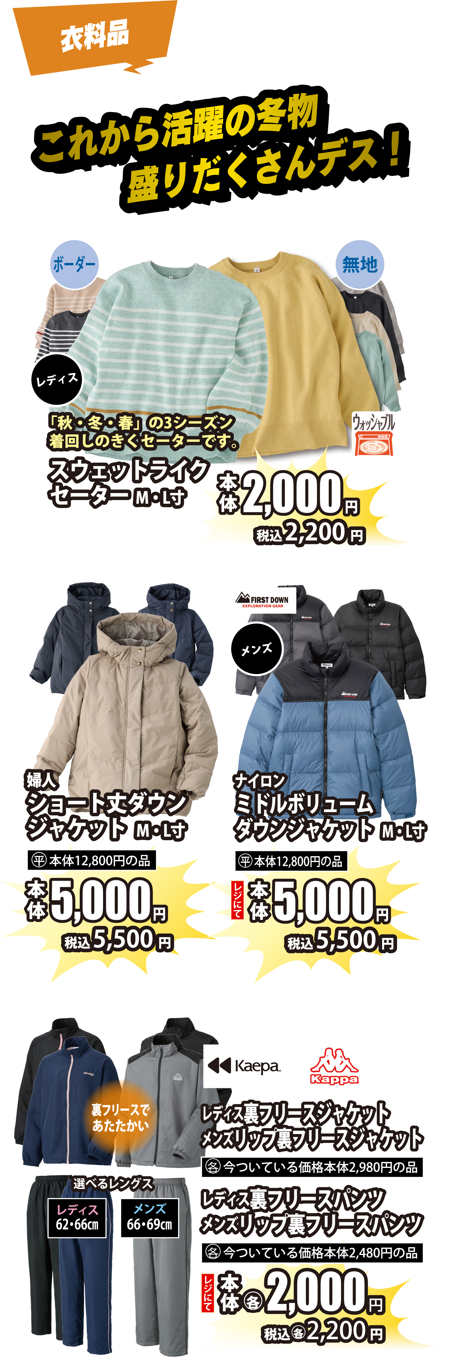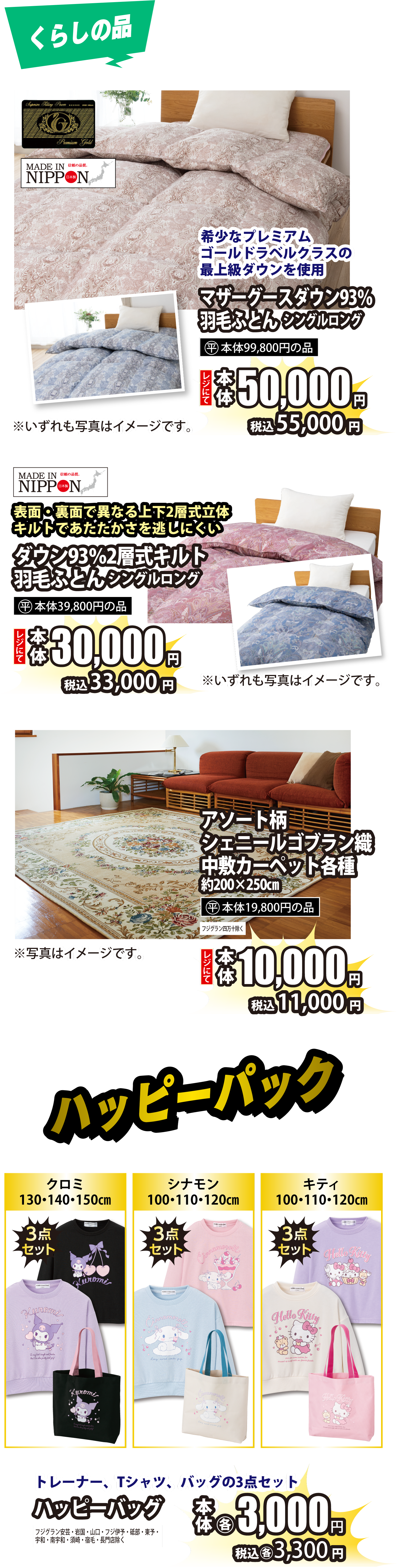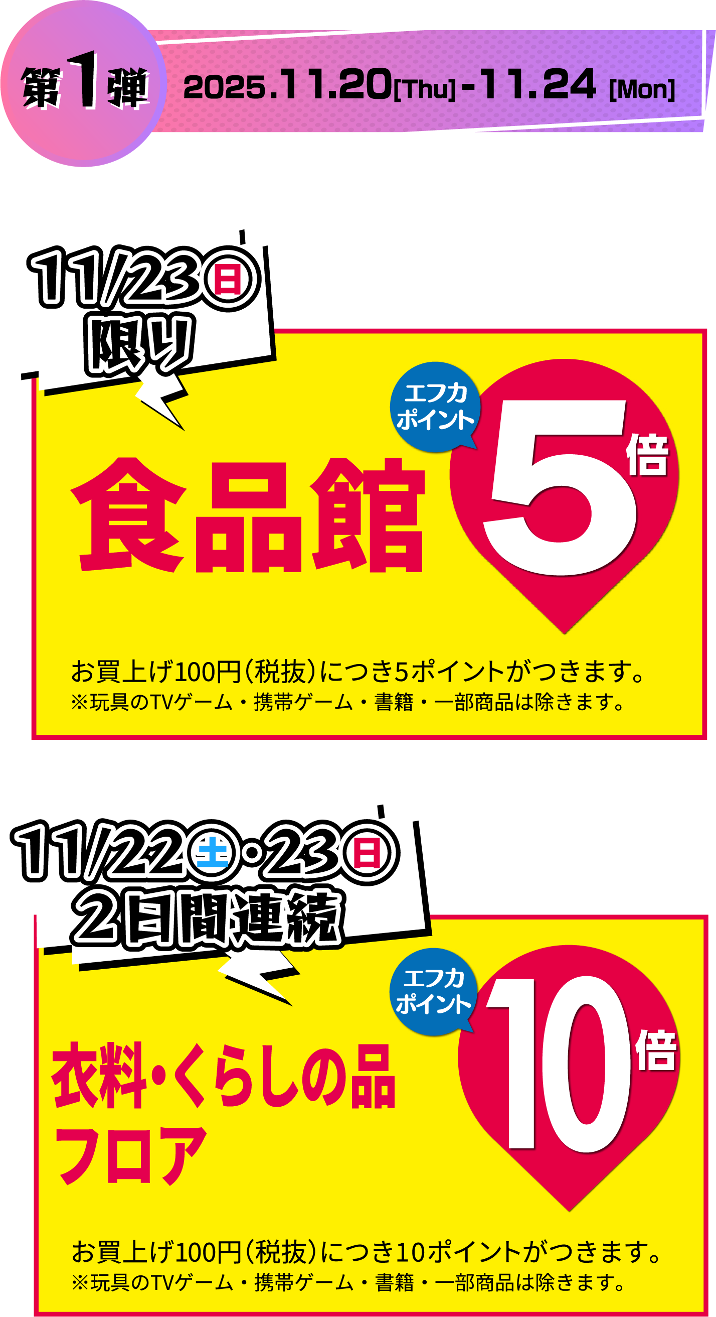 - ①期間中に、衣料・くらしの品フロアで、1回のご精算2,000円(税込)以上お買物して、ラッキーカードをゲットしよう!