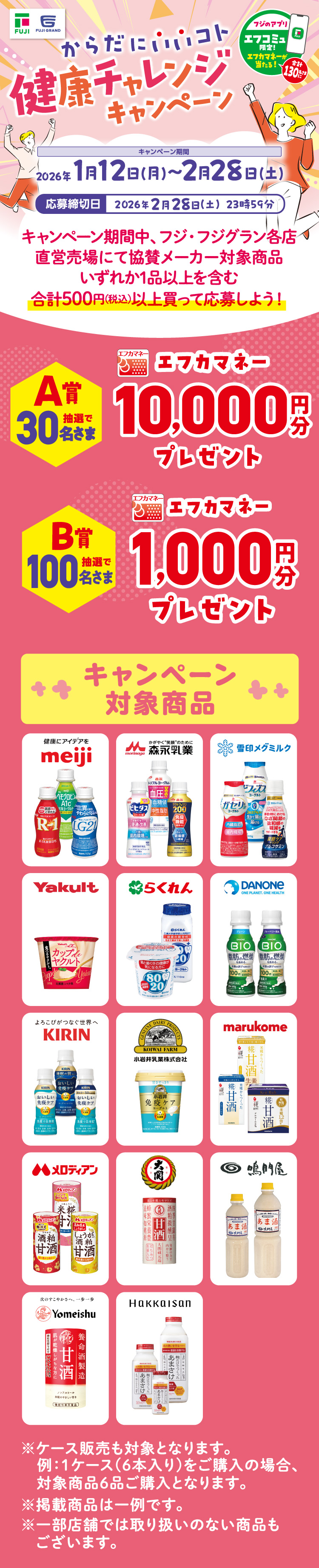- (3)キャンペーン期間中、フジ・フジグラン各店直営売場にて、協賛メーカー対象商品いずれか1品以上を含む、合計500円(税込)以上のお買い上げで応募完了になります。