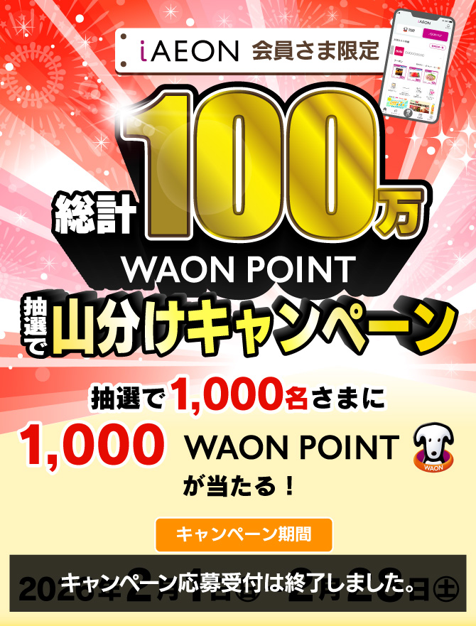 - ・キャンペーン事務局の判断により不正が認められる、もしくは不正の疑われる場合には、ポイント進呈の対象外とさせていただきます。不正行為等があった場合、「iAEON利用規約」「AEON Pay利用規約」「WAON POINTサービス規約」に基づき、会員サービスの一時停止等の措置をとらせていただくことがあります。