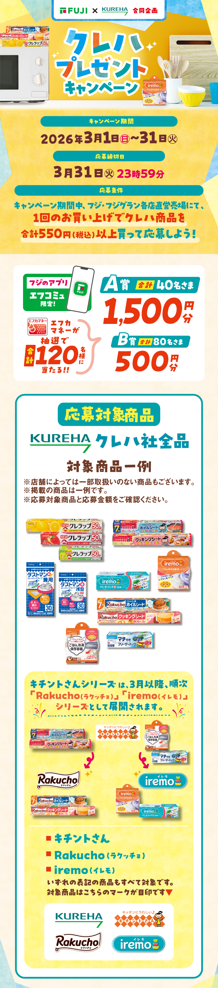 - (3)キャンペーン期間中、フジ・フジグラン各店直営売場にて1回のお買い上げでクレハ商品を合計550円(税込)以上のお買い上げで応募完了になります。