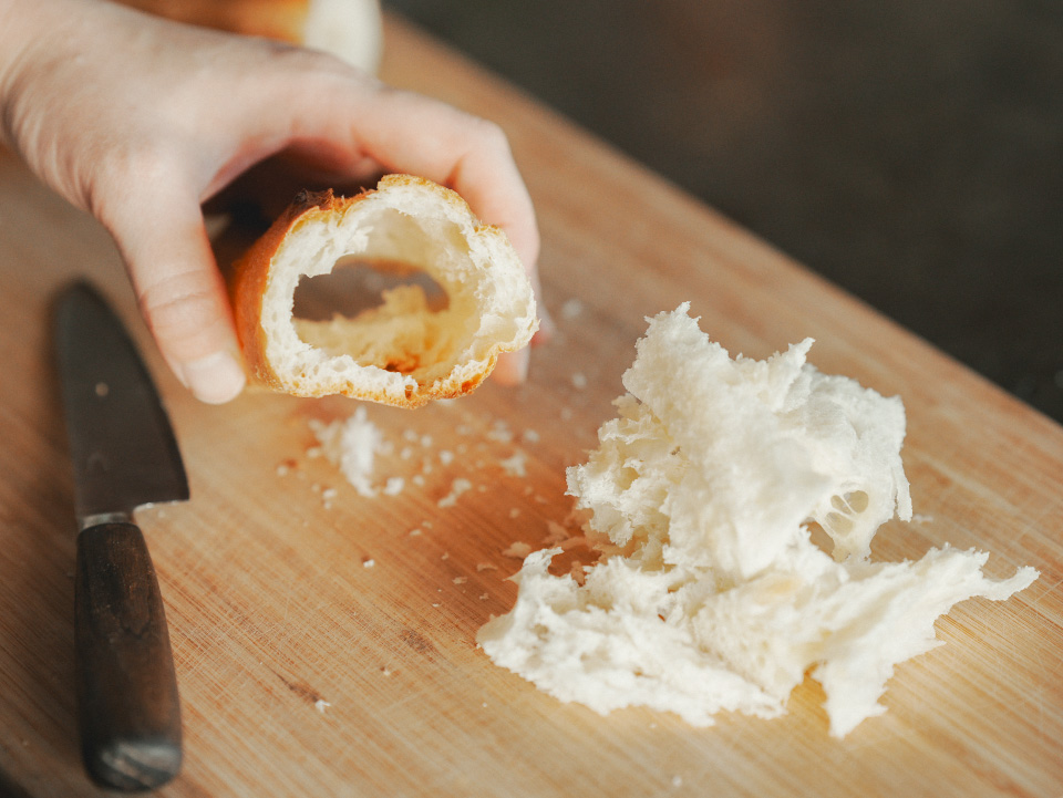 ①バゲットを半分にカットし、ナイフなどを使って中をくり抜き、中身はみじん切りにしておく。