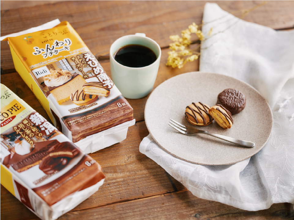 柑橘があしらわれたパッケージは「ことりっぷ えひめ南予」の表紙とのコラボレーション。さらに、同時発売として、新潟の人気カフェ「編むと紡ぐ」監修の「焙じ茶のタルトショコラ」味の小さなチョコパイ。こちらも香ばしい焙じ茶が香るコクのある味わい。「Ridi」のふんわりチーズケーキと合わせて、限定の美味しさを味わってみてください。