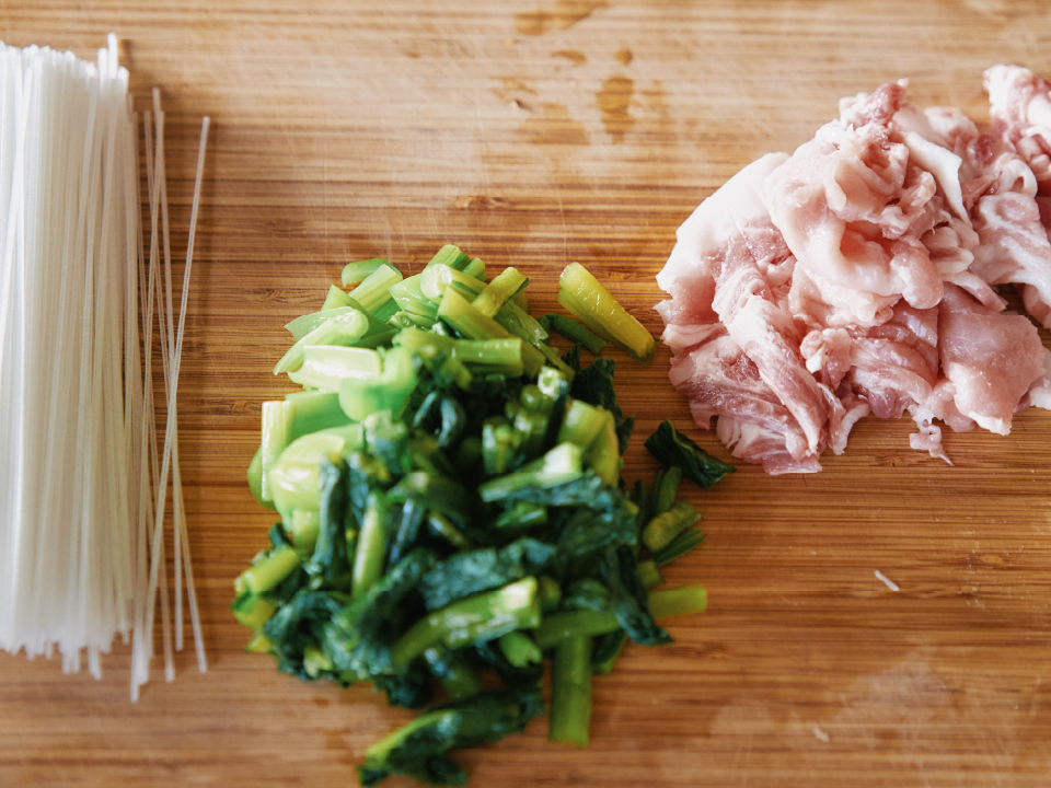①野沢菜は3センチくらいの長さに、甘とろ豚も同じくらいの幅にカットしておく。