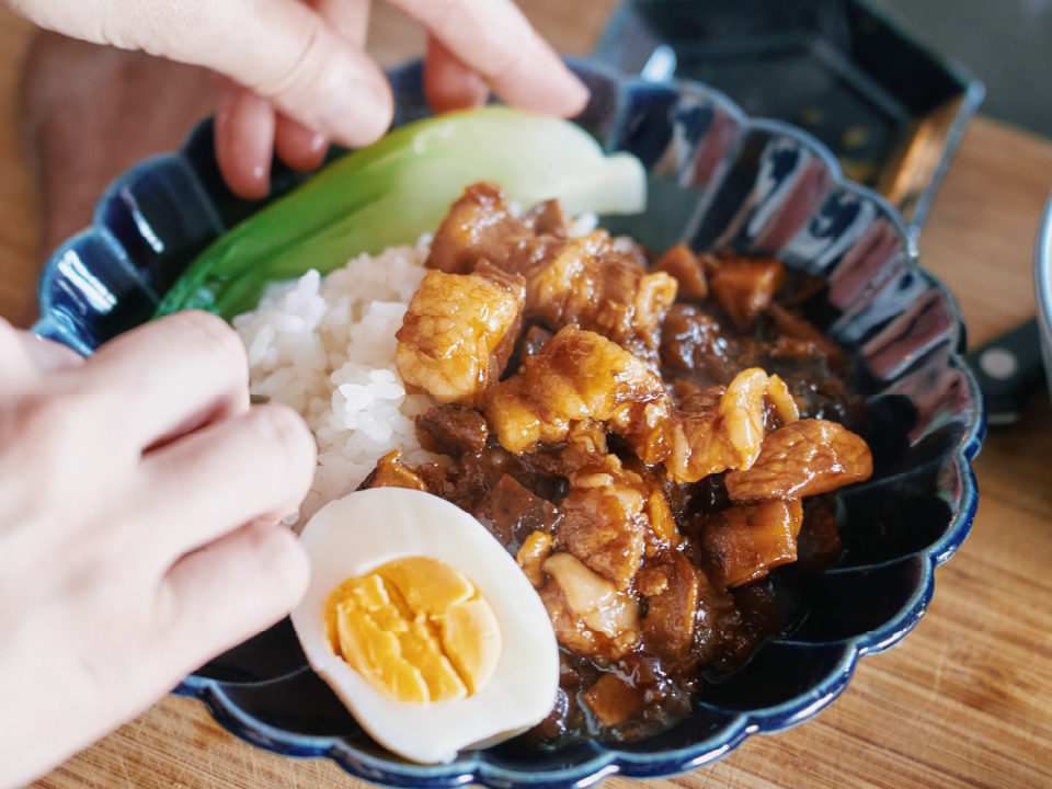 ④お皿にご飯を盛り、③の煮込んだ豚肉、茹でた青梗菜、茹で卵を盛り付けたら完成。
