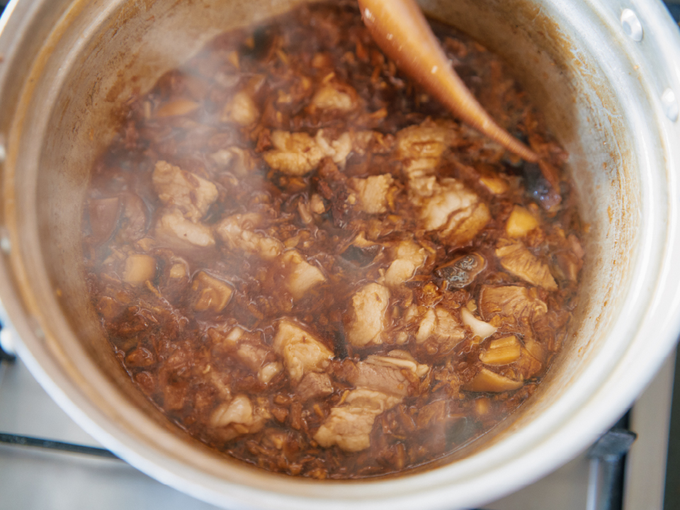 ③ある程度アクが出なくなったら、オイスターソース、砂糖、濃口しょうゆ、八角、フライドオニオンを加えて弱火〜中火で柔らかくなるまで煮込む。