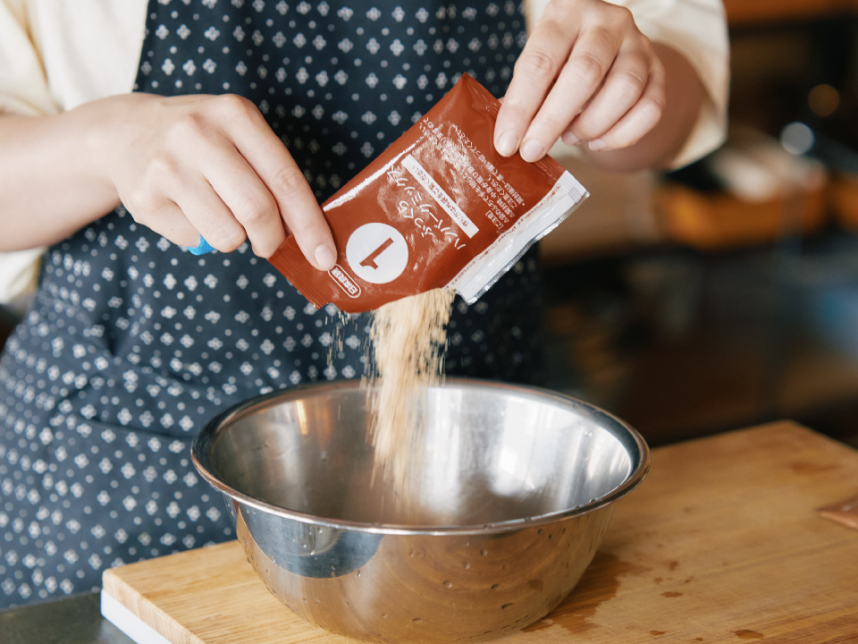 ①ふっくらハンバーグミックスに水を加えて軽く混ぜる。少しふやけたら、合い挽き肉、卵、炒め玉ねぎベースを加えてよく混ぜる。