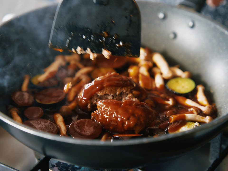 ④弱火にし、ハンバーグをひっくり返して5〜7分とろみがつくまで煮込んだら完成。