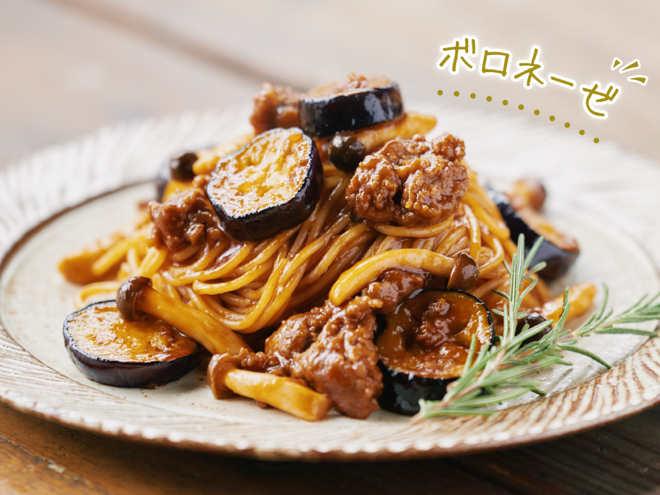 ハンバーグはゴロゴロ感が残る程度に崩すと、食べ応えのあるボロネーゼになります。お好みで粉チーズをかけても。今回はなすとしめじを使いましたが、いろんな野菜との相性も良いのでお好きな野菜で試してみてください。