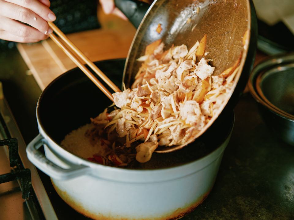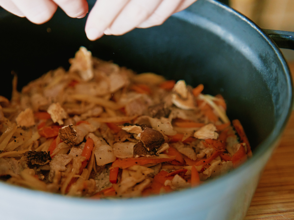 ③浸水したお米に水を入れ、②の具材を加えたら、干し椎茸を手で適度な大きさにちぎりながら加える。