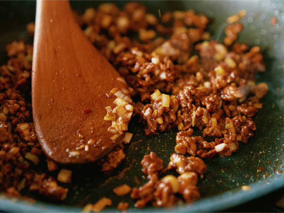 ③豚ミンチに火が通ったら、甜麺醤、豆板醤を加えて炒め、香りが出てきたら、ネギ、水、鶏ガラスープの素を入れる。