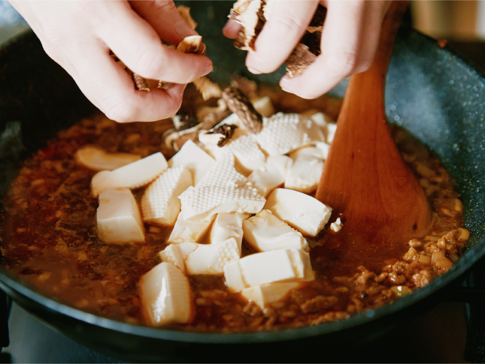 最後に干し椎茸を入れますが、ちゃんと柔らかくなります。むしろ程よい弾力を持った具材のひとつとして存在感があり、噛むと旨みがじゅわっと溢れてくる、コクのある麻婆豆腐です。