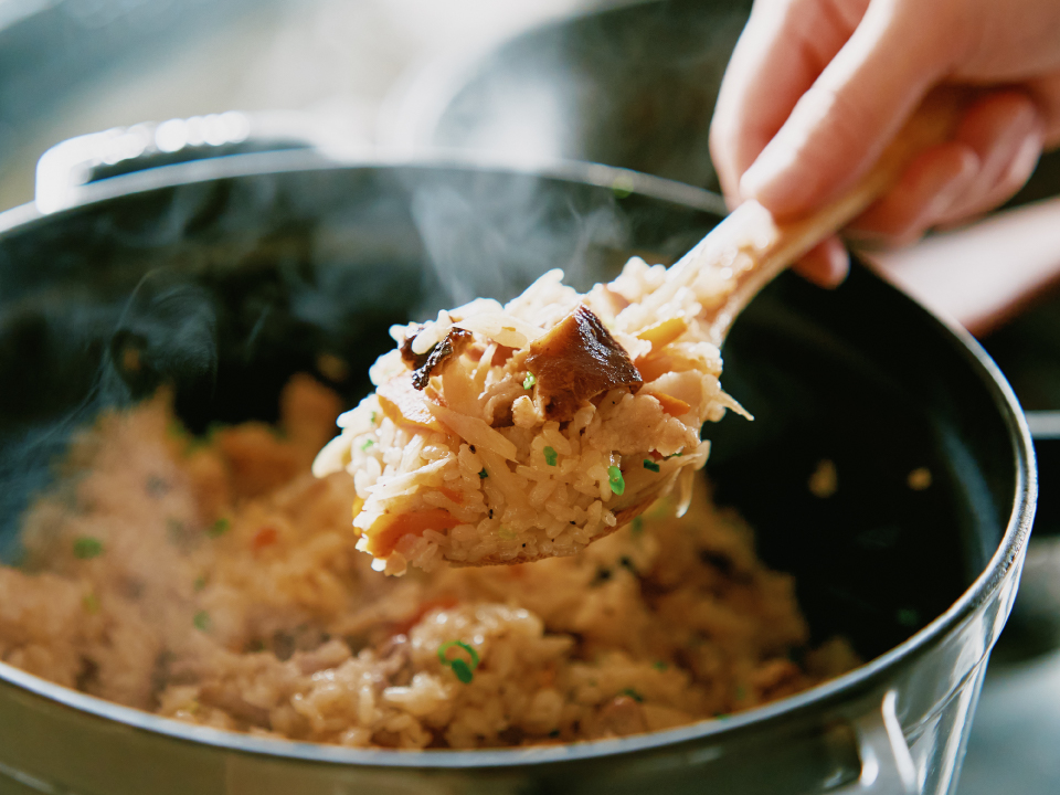干し椎茸がお出汁や野菜の旨みを吸い、さらに椎茸の香りや旨みがご飯全体に行き渡っています。豚の脂とブラックペッパーがアクセントになっていて、和風ながらも一味違う炊き込みご飯になります。
