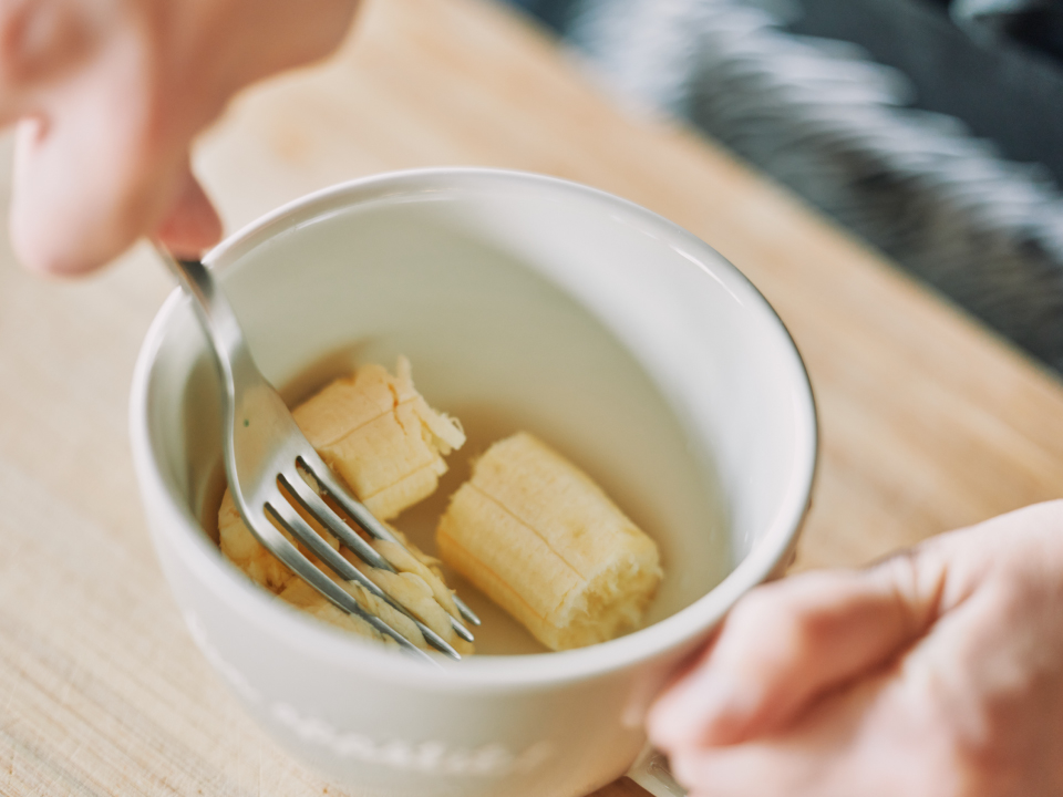 ①耐熱のマグカップにバナナを入れ、フォークでピューレ状になるまで潰す。