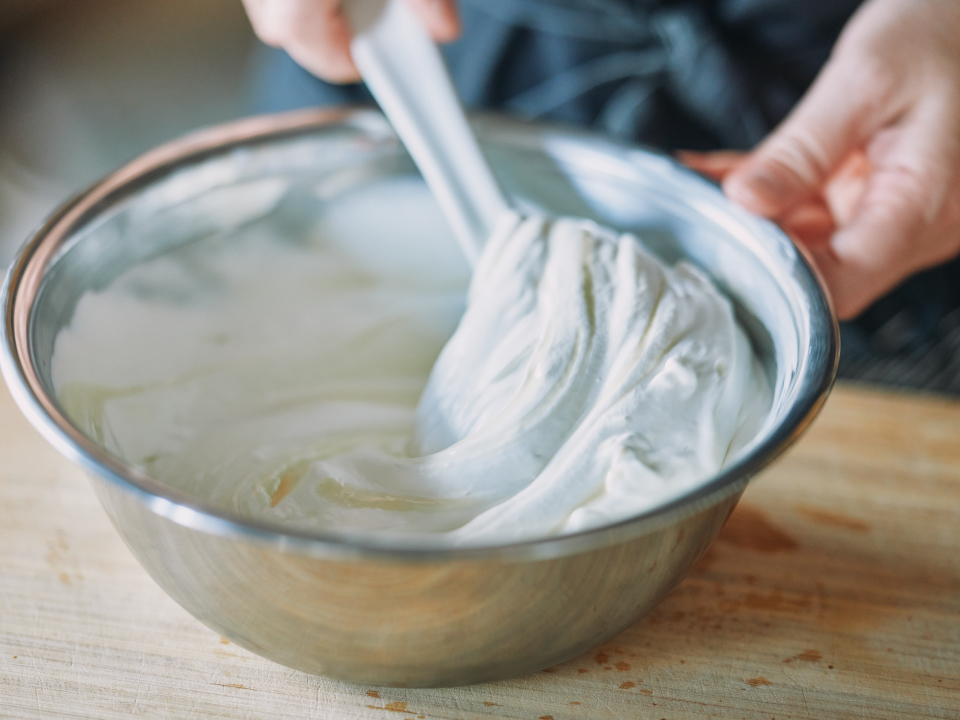 ②80℃程度に温めた牛乳に、水でふやかしておいたゼラチンを溶かし①に加える。氷水で冷やしながら7分に泡立てた生クリームを加えて全体を混ぜ合わせる。