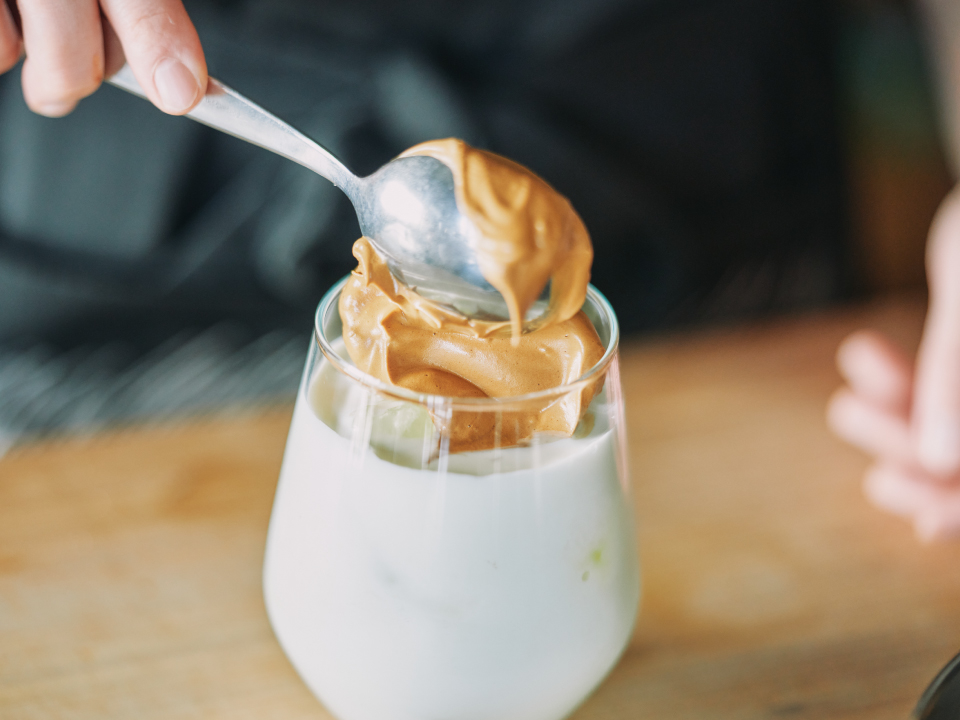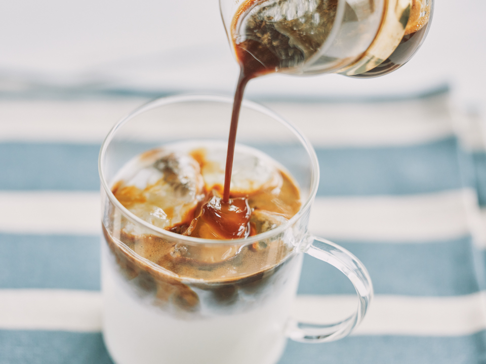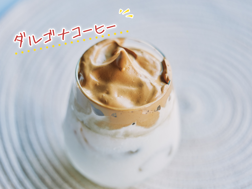 韓国発のダルゴナコーヒーは、ふんわりホイップしたコーヒーで作るコーヒー。ふんわり&とろ〜りコーヒーを少しずつ牛乳に溶かしながら味わいます。氷はお好みで。