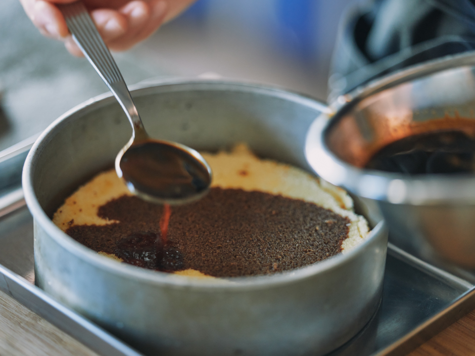 ③ネスカフェエクセラ、熱湯、コーヒーリキュール、ガムシロップを混ぜ合わせた液を作り、型にはめたスポンジケーキに染み込ませる。