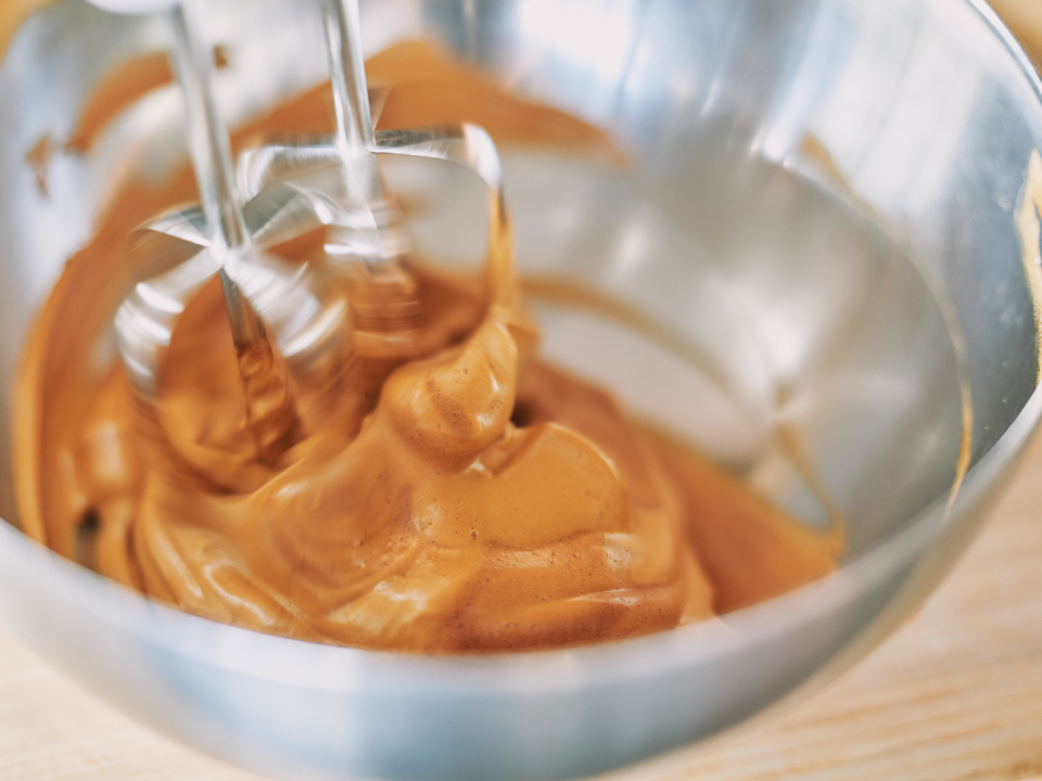 ①ネスカフェエクセラ、グラニュー糖、お湯をボウルに入れてハンドミキサーで泡立つまで混ぜる。