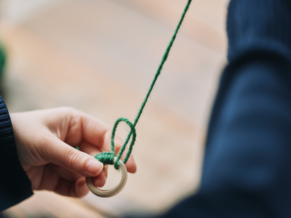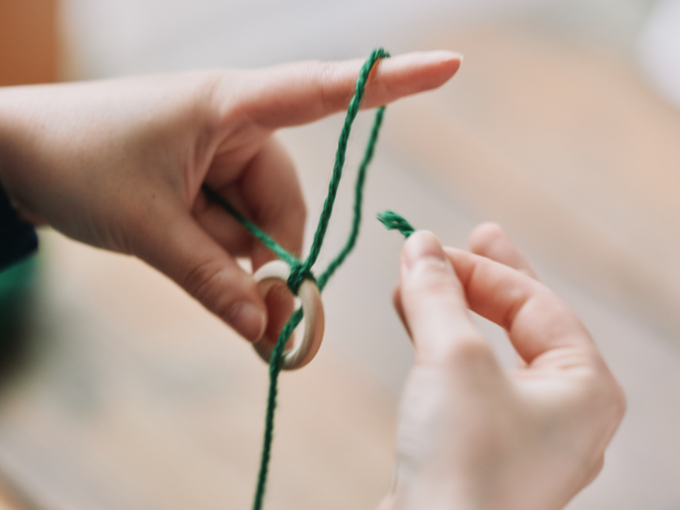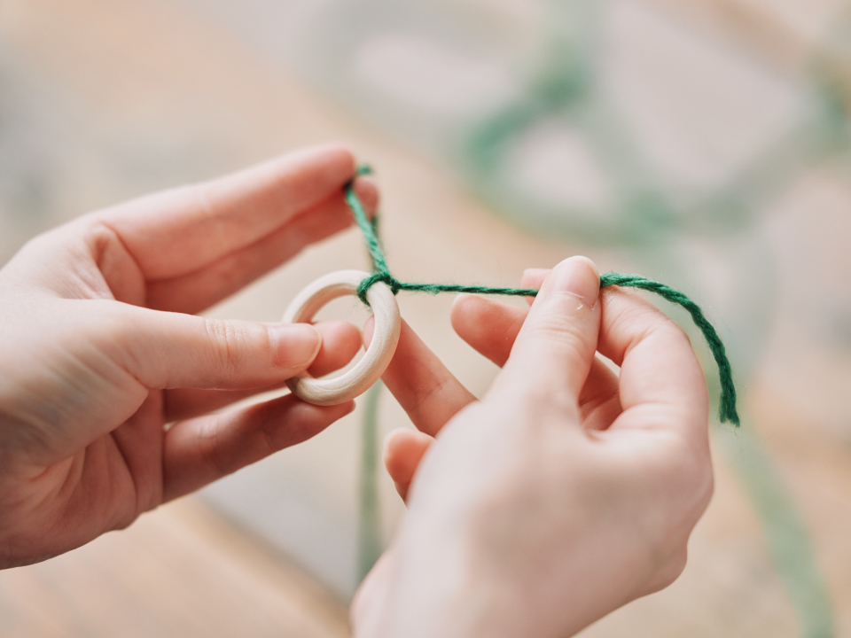 ①毛糸を1.5メートル程度にカットし、片方を10センチほど残して木製リングに結ぶ。