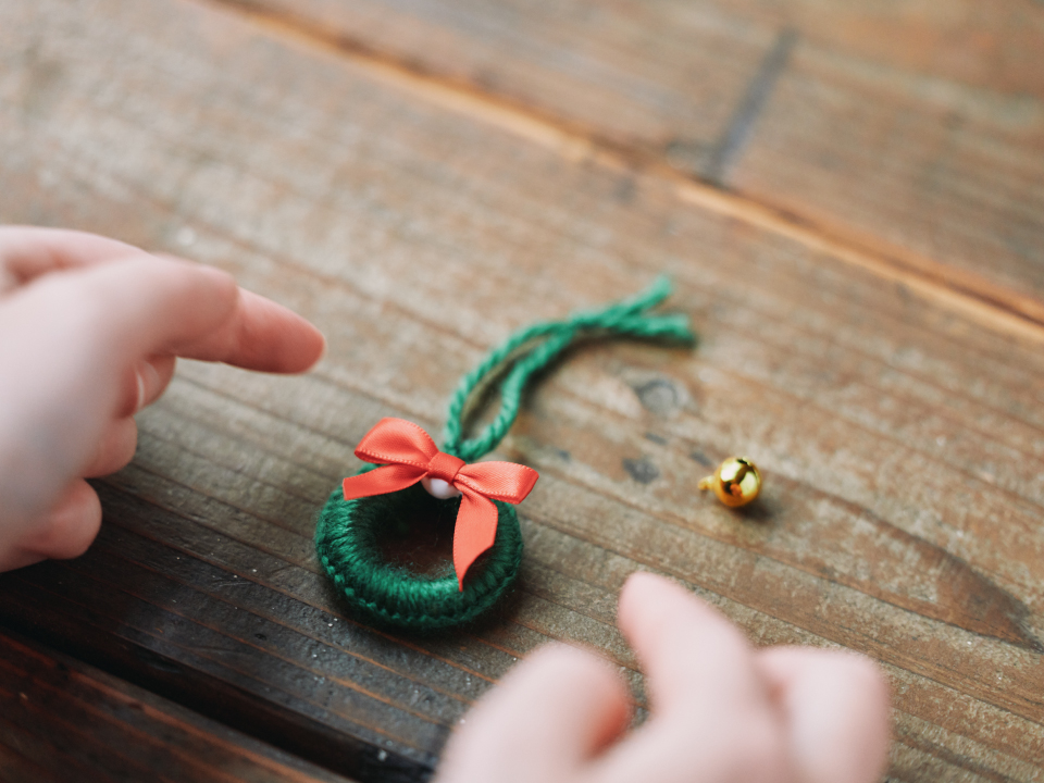 ③最初に残しておいたところと、巻き終わった糸を結び、輪を作る。リボンや鈴を糸やボンドで付ける。