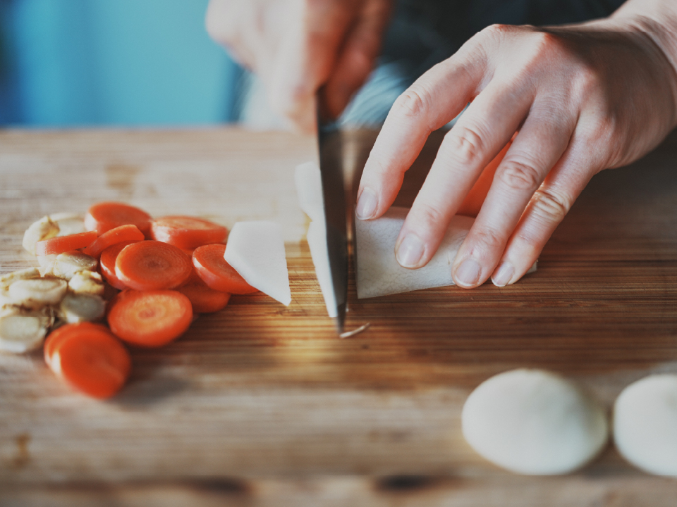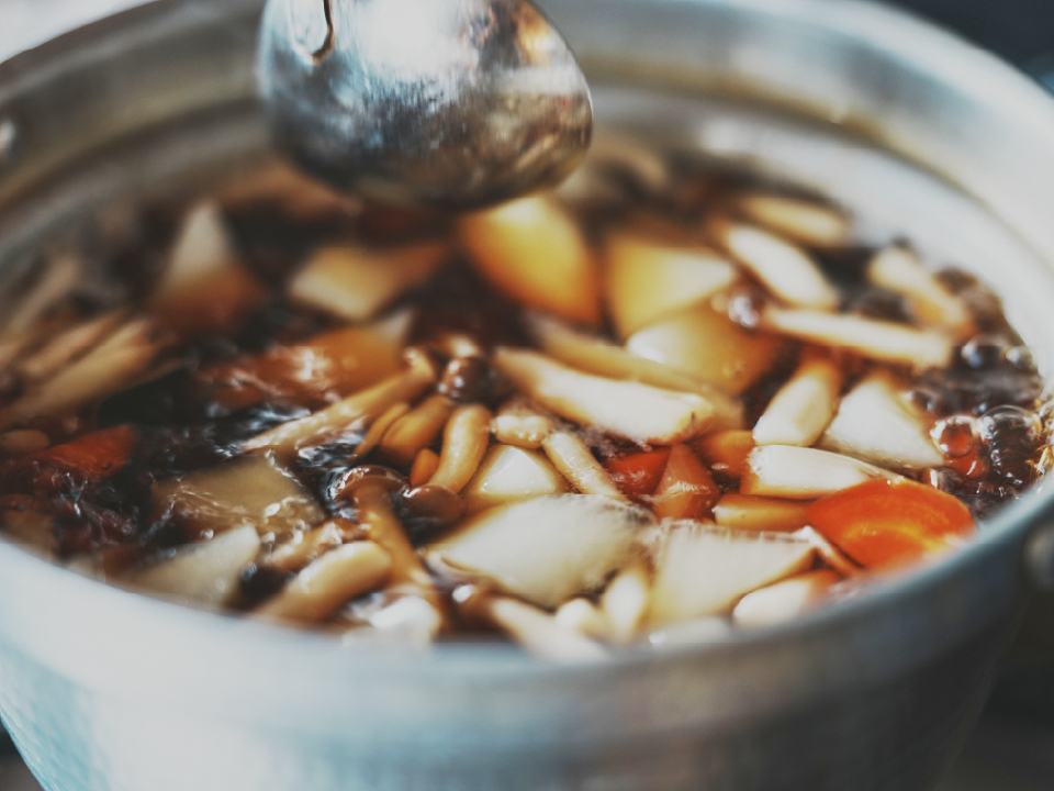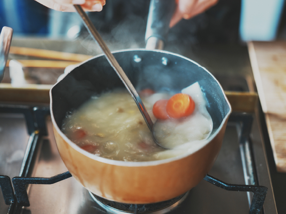 ②鍋に昆布だしを入れ、①の野菜を入れて火が通るまで煮る。大根が透き通ったら、みりんと白みそを加える。