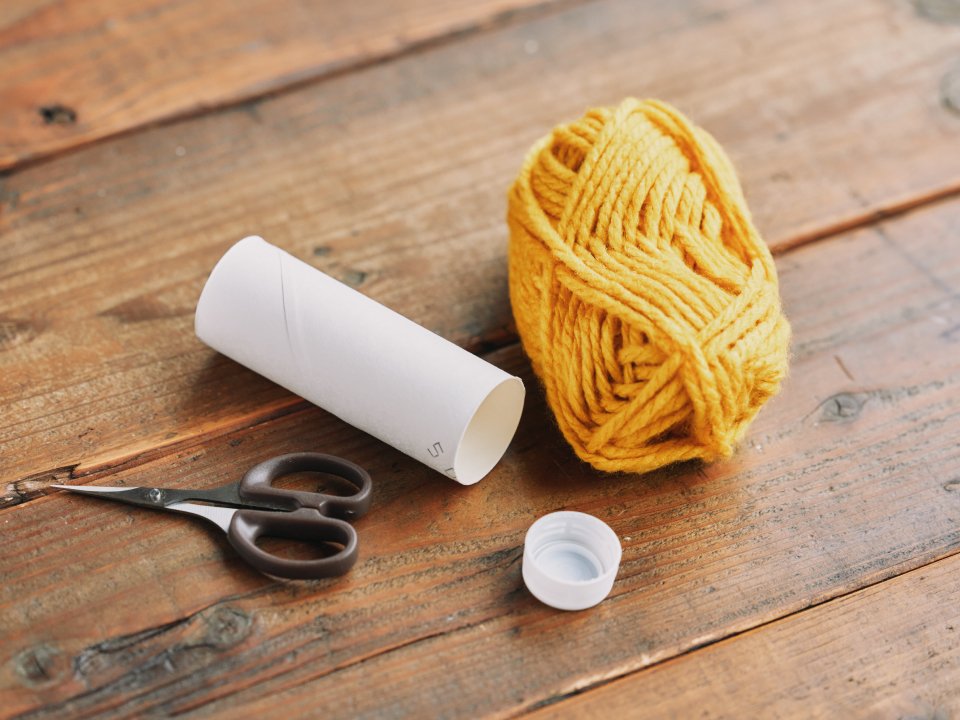 好きな色の毛糸、トイレットペーパーの芯、ペットボトルキャップ