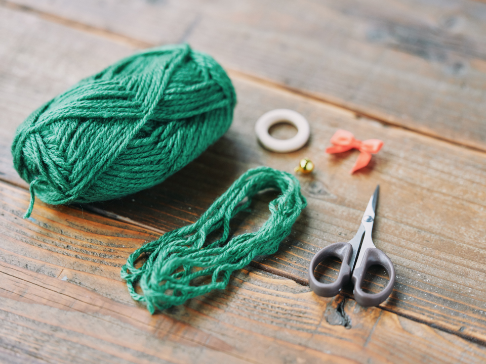 好きな色の毛糸、鈴、木製リング、リボンなど