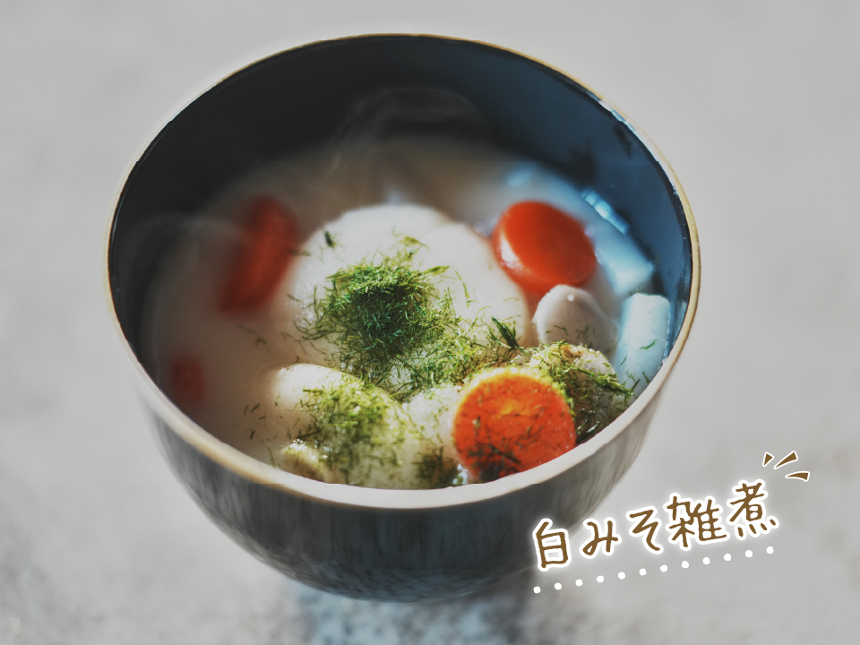 動物性のものを使用していないお野菜だけの優しい甘味に、白味噌のまろやかさで、ほっこり心もおなかも癒される味わい。トッピングは青のり(あおさ)で香りをプラスするのがおすすめです。京都をはじめとする地域では白みそのお雑煮が親しまれており、香川県では、あんこ入りのお餅を使うのが特徴です。
