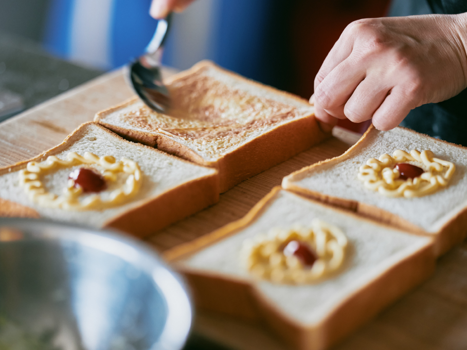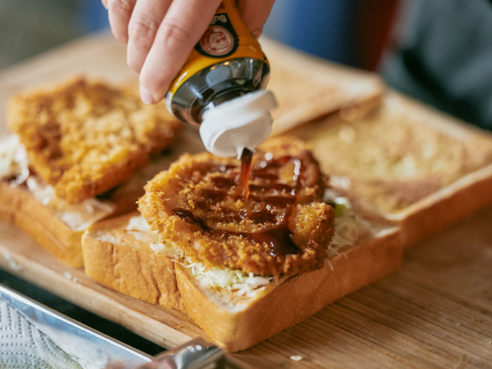 ⑤パン4枚それぞれにマヨネーズ、ケチャップを塗っておく。2枚のパンにキャベツ、とんかつソース、揚げたカツ、とんかつソースの順に乗せ、それぞれ何ものせていないパンで挟み込む。