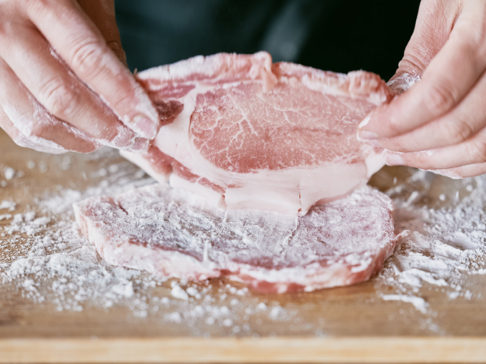 ①豚ロースの筋を包丁で切り、塩、コショウを軽くふってから小麦粉(分量外)をまぶす。