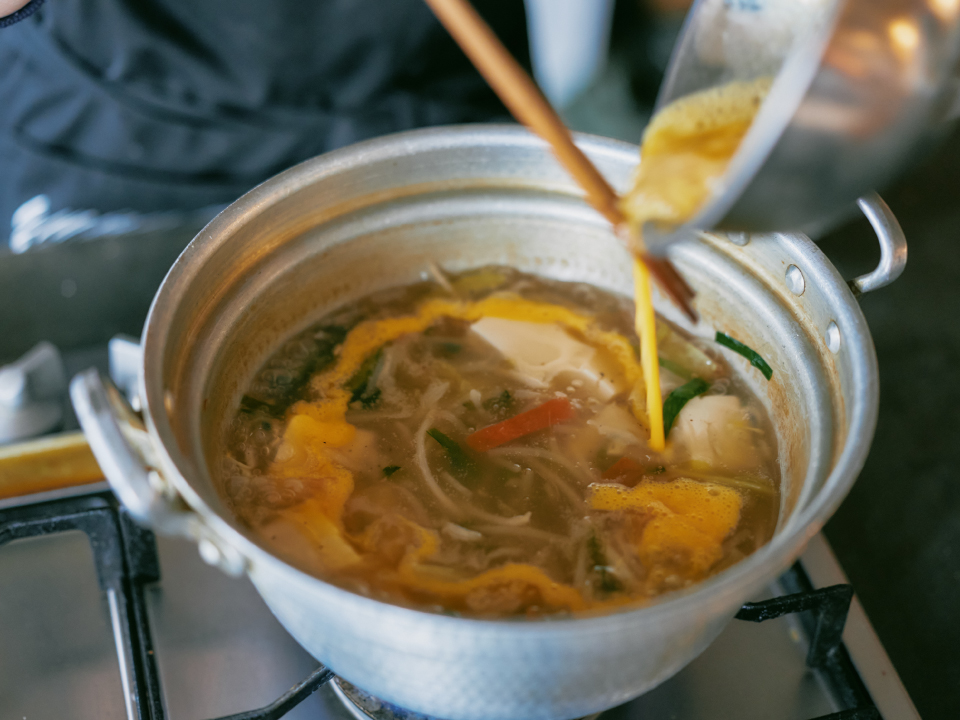 ②①が沸騰したら食べやすい大きさにカットした絹ごし豆腐を加える。豆腐が温まったら、水とき片栗粉を加えてとろみをつけ、最後にとき卵を加える。