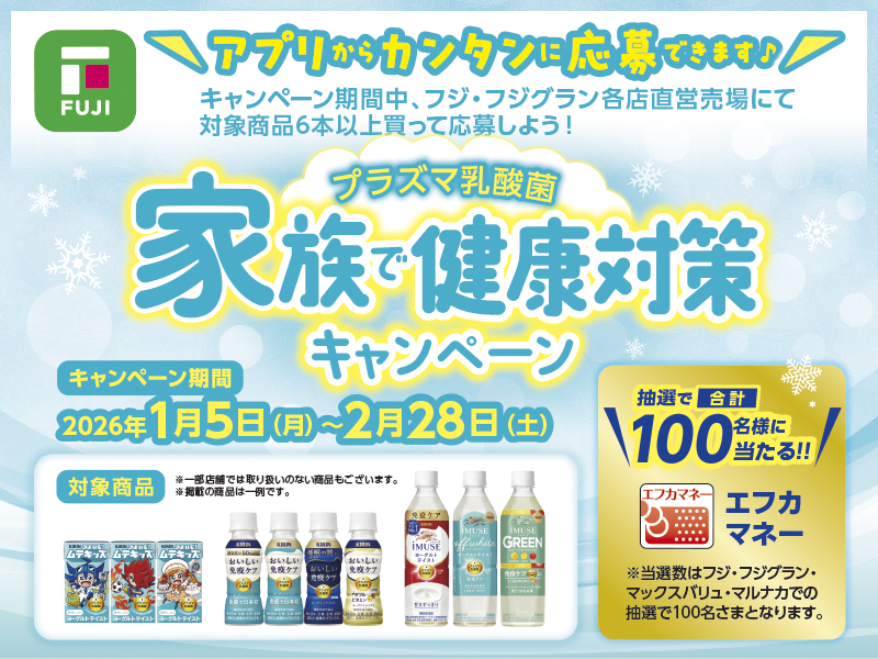 期間中、今回ご紹介したキリンの『プラズマ乳酸菌』シリーズの対象商品を6本以上購入するとエフカマネーが当たるキャンペーンを開催。応募の締め切りは2026年2月28日(土)まで。詳しくはフジのアプリ「エフコミュ」をチェック!