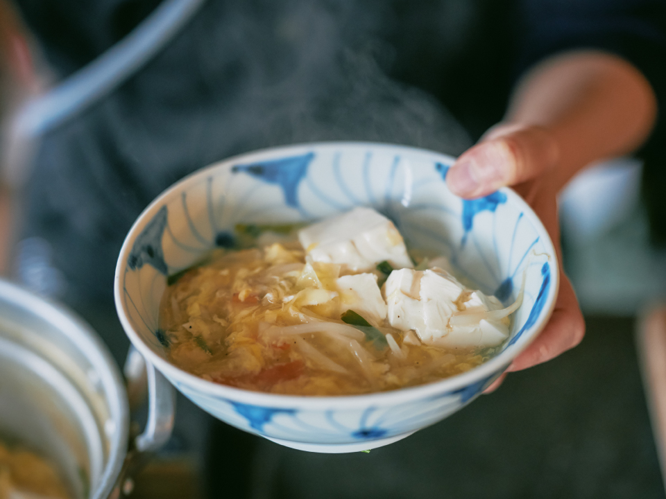 野菜もたっぷりとれてお腹に優しい豆腐のたんぱく質も含まれるため栄養価も◎。とろりとしたスープで体の芯から温まります。勉強で疲れた心と体を解きほぐす一杯になることうけあいです。