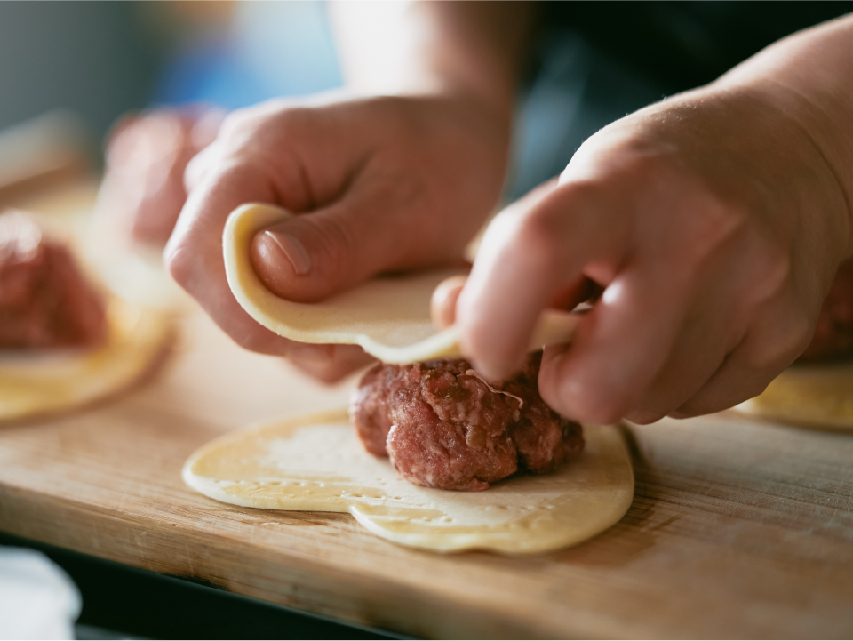 ③パイシートの真ん中に ①のハンバーグを置き、 周りに溶き卵を塗って パイシートを重ねて、 フォークでしっかりと くっつける。さらに上から溶き卵を塗っておく。