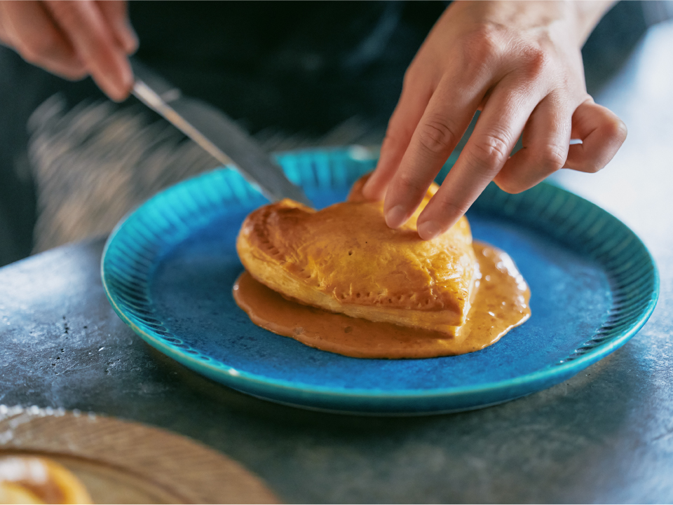 ⑥お皿に⑤のソースを広げ、焼き上がったミートパイをのせ、パセリを軽く散らしたら完成。