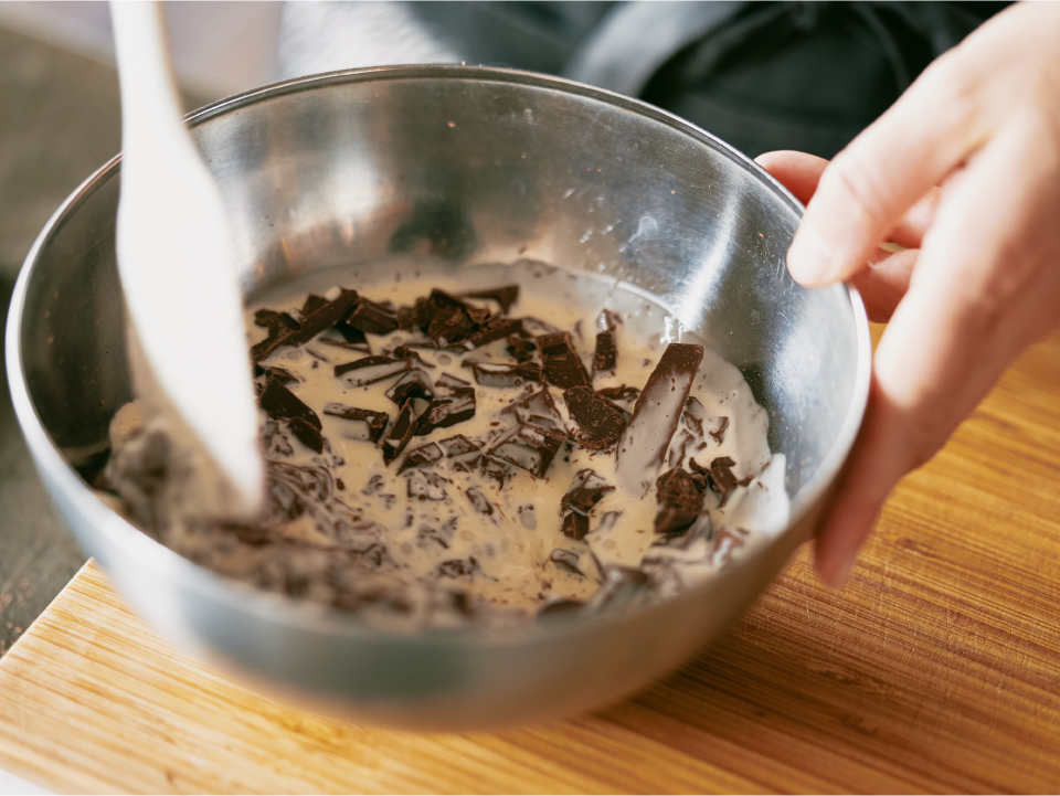 ③少しずつ①のチョコレートに②を加えながらゴムべらで空気が入らないように混ぜて溶かす。