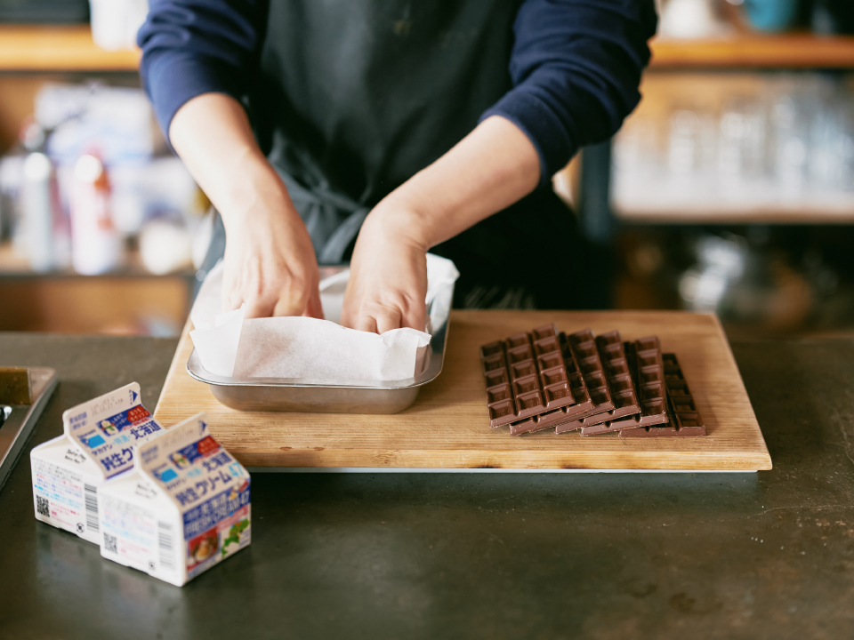 ①ミルクチョコレートを包丁で細かくカットし溶けやすくしておく。