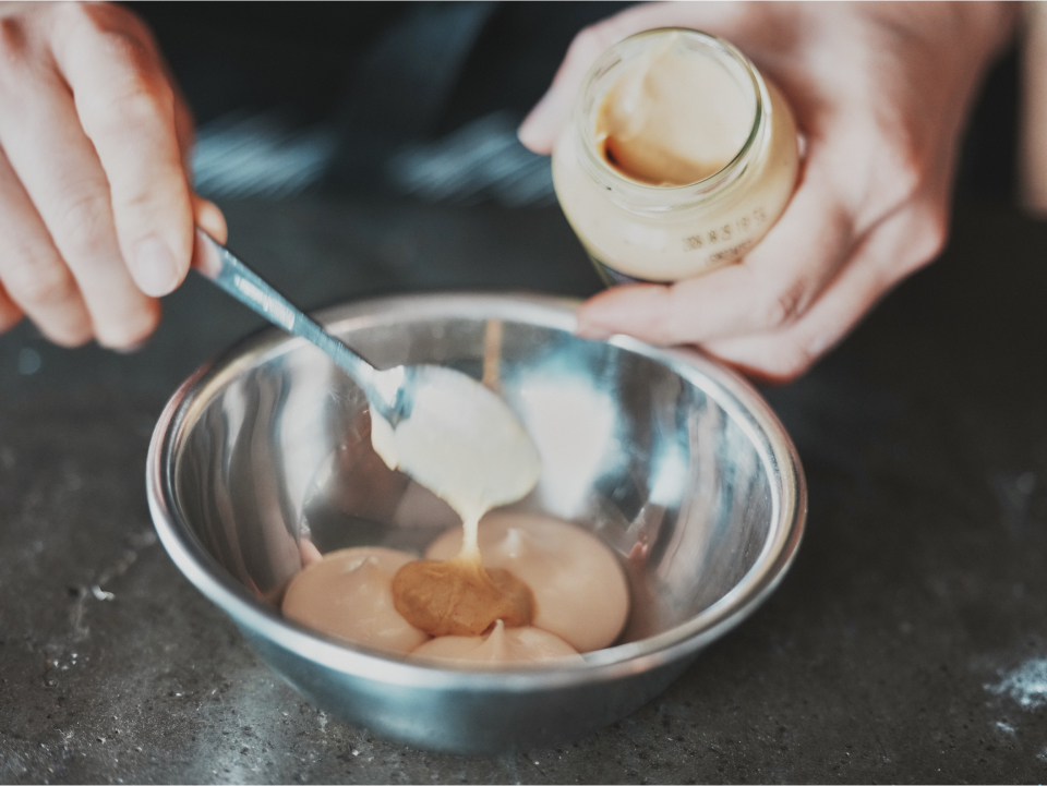 ①マヨネーズ、フレンチマスタード、白味噌を混ぜてソースをつくる。