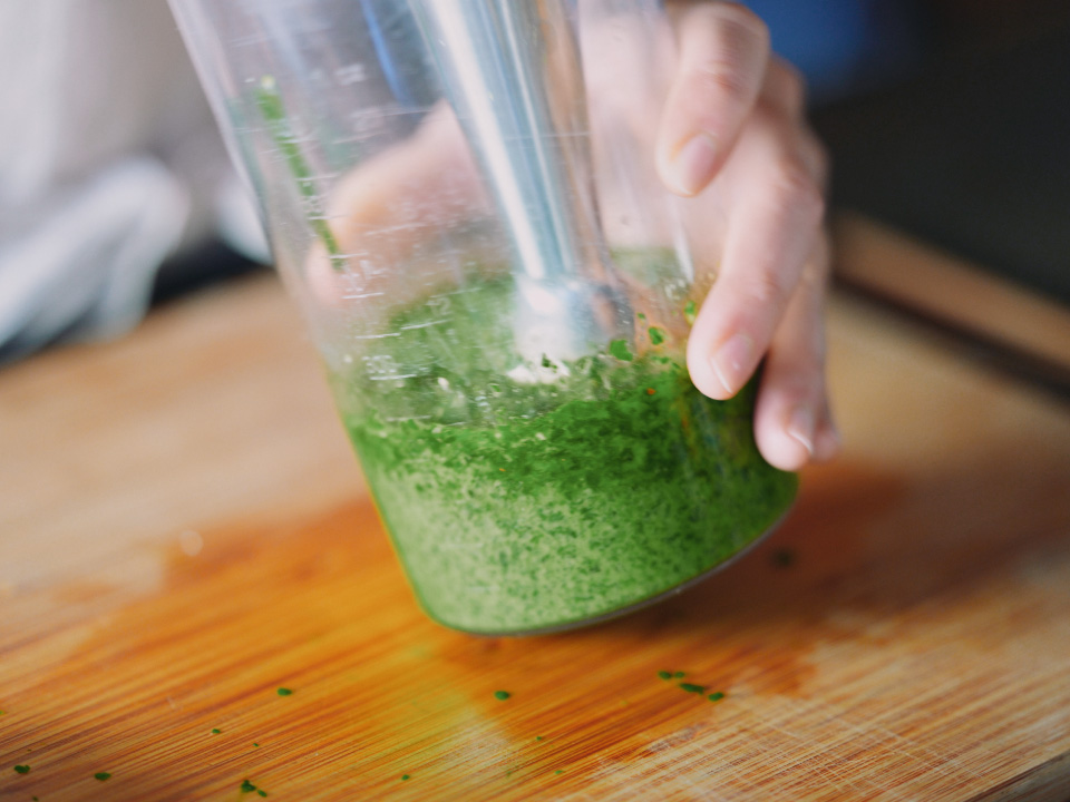 ③①の葉の部分をブレンダーに入れてオリーブオイル、くるみ、塩を加えて撹拌する。そこに茹で汁を加えて混ぜ合わせておく。