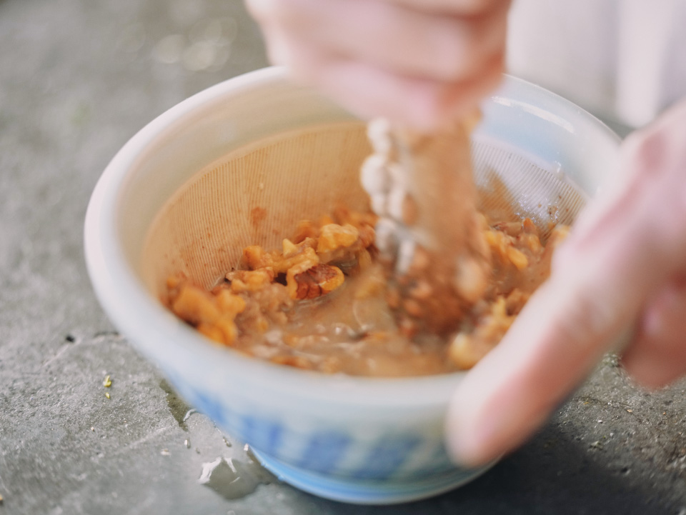 ②くるみを擦り漕ぎで軽く潰し、好みの大きさになったら、麦味噌、出汁、うすくち醤油を混ぜる。
