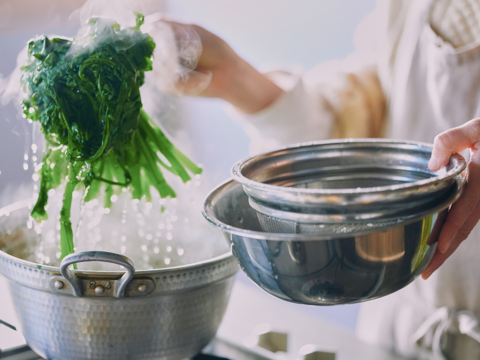 ①鍋に湯を沸かし、沸騰したら春菊を茎から先につける。30秒ほど茎を茹でたら全体を入れて30秒ほど茹でる(合計1分程度)。茹で上がったら水に取り、水気をしっかり切ってから、食べやすい長さにカットする。