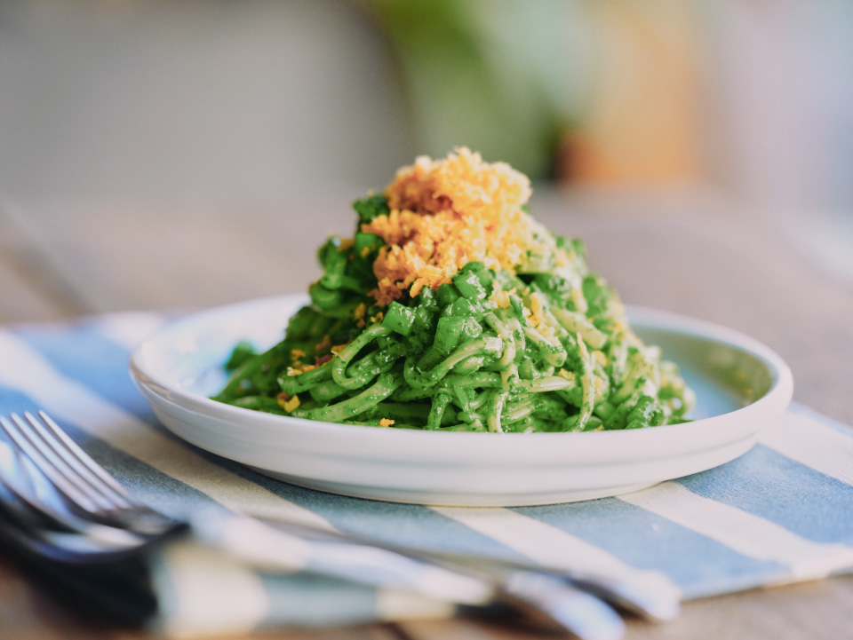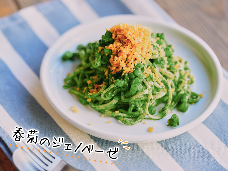 まるでお店の味!と感動間違いなしの、春菊のジェノベーゼ。なめらかでコクのあるソースに、茎の食感、香ばしいパン粉がアクセントに。冷めても香りが良いので、お弁当のおかずにもGoodです。