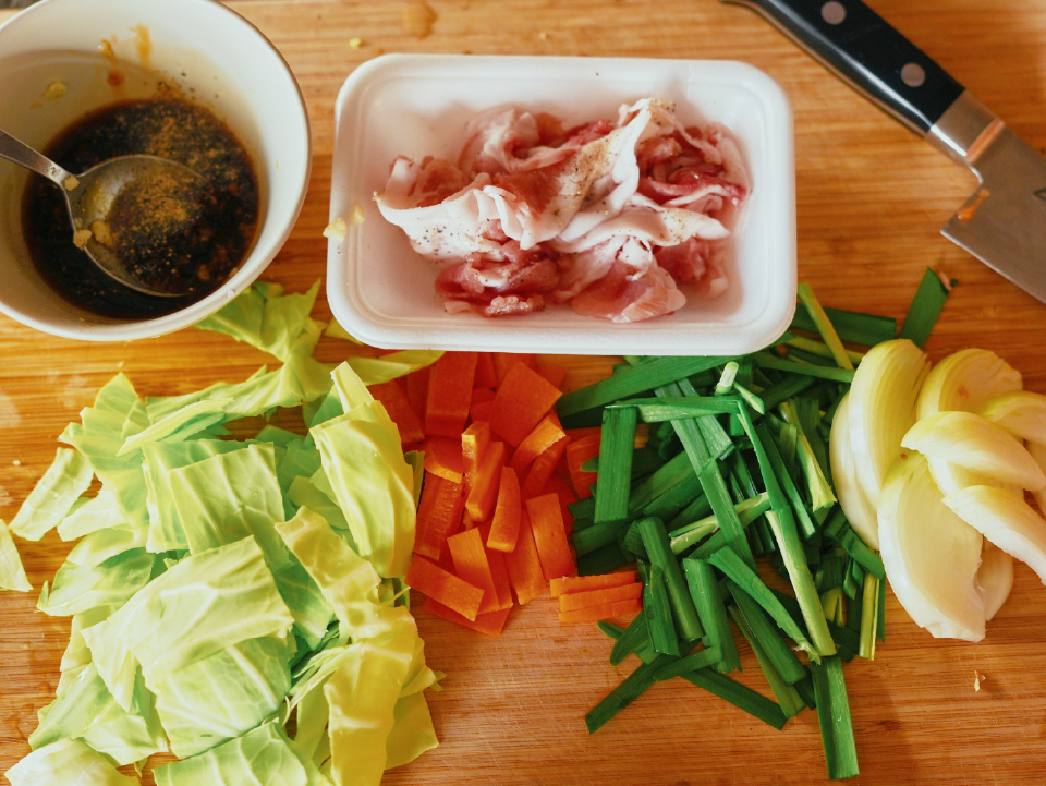①キャベツはざく切り、にんじんは短冊切り、ニラは3~4cmのざく切り、玉ねぎは薄切りにカットしておく。豚肉には下味を揉み込み、5分ほど置く。合わせ調味料は混ぜておく。
