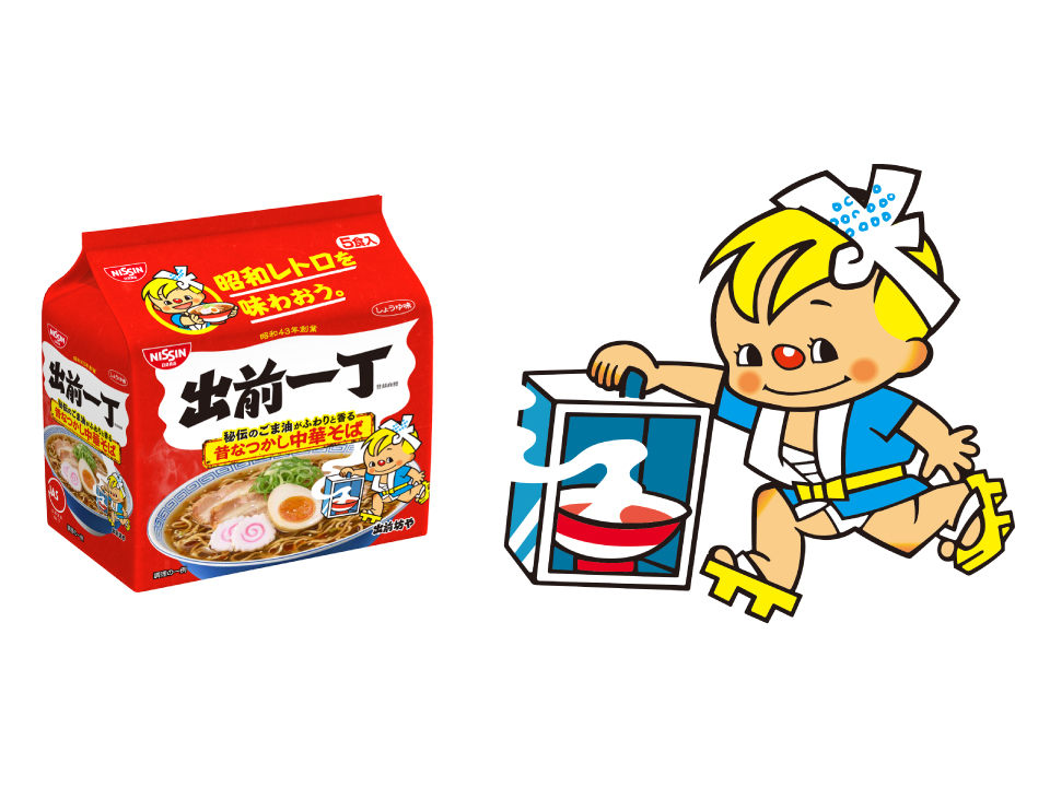 青い半被にはちまき、そして熱々のラーメンを入れた岡持を持った出前坊や。ちょっぴりやんちゃで、語尾に「〜じょ」をつけて喋るのも可愛く、アニメーションを使ったテレビCMも人気でした。そしてそんな出前坊やが登場するパッケージも時代に合わせて少しずつ変化が。昭和レトロな雰囲気は残しつつ、「出前一丁」の美味しさを伝えています。