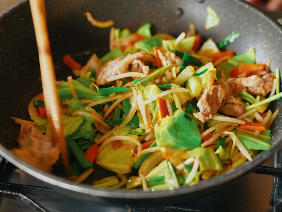 ③にんじん・玉ねぎを先に入れて1〜2分炒めたら、残りの野菜をキャベツ→もやし→ニラの順に入れ、水分が出ないように強火で手早く炒める。