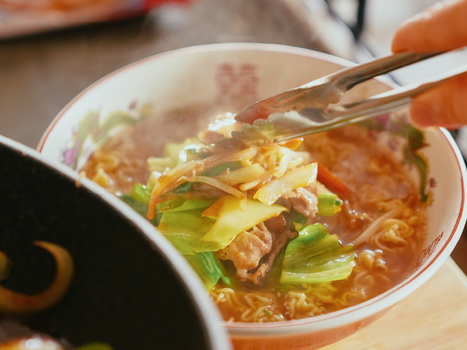 合わせ調味料をあらかじめ作っておき、一気に炒めることで野菜がシャキッと仕上がります。スッキリとした出前一丁スープに、ほんのり甘めの野菜炒めがよく合います。