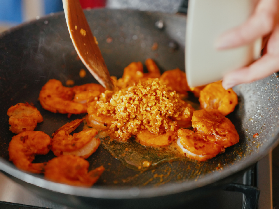 ③②のフライパンにそのままオリーブオイルをひき、①のエビを焼く。殻が色付いたら、ニンニクとバターをフライパンに戻し、全体に絡めながら塩とカイエンペッパーを加える。