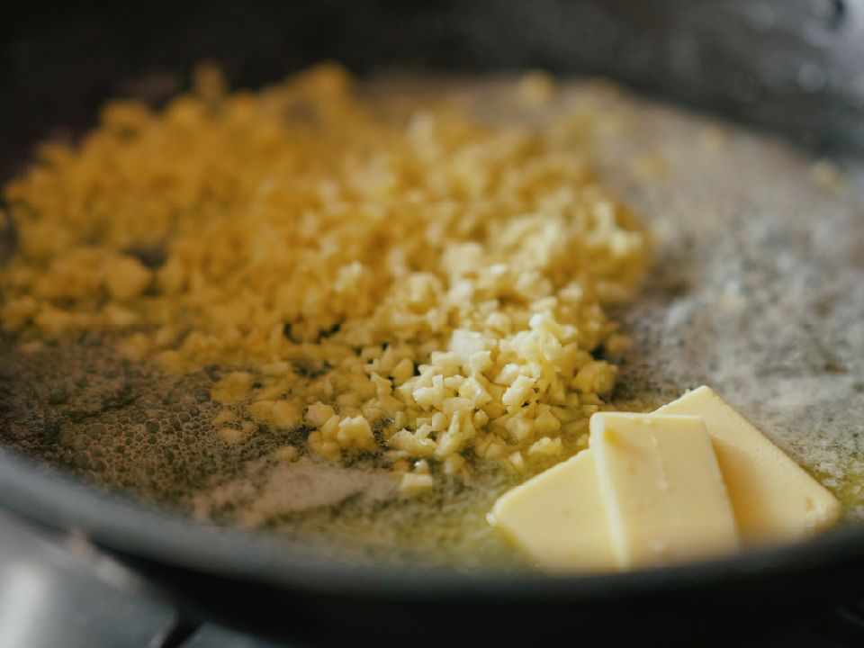 ②ニンニクを全てみじん切りにし、フライパンでバターを溶かしてから弱火でニンニクを炒めていく。こんがりと色付いたらニンニクを一旦取り出す。