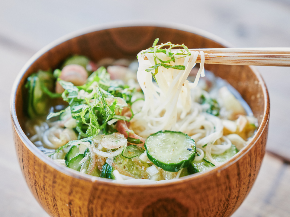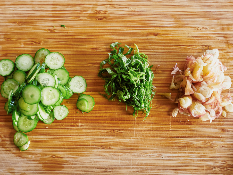 作り方は、特製冷や汁の素を水で割り、きゅうり、みょうが、大葉を刻んで入れるだけ。