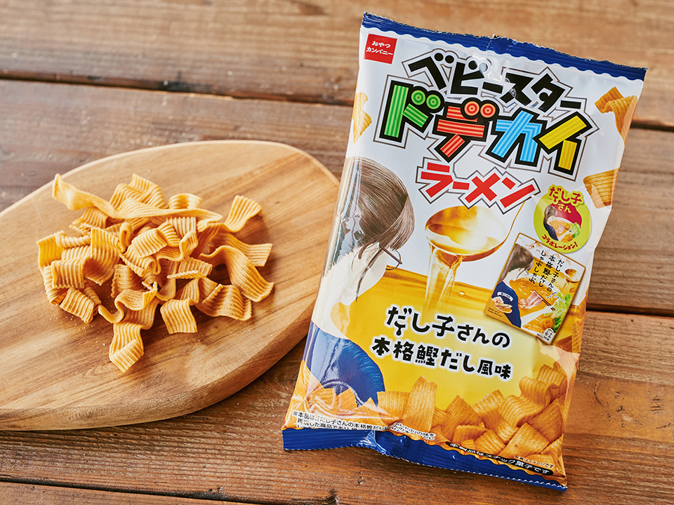 幅広形状の「ベビースタードデカイラーメン」が、だし子さんのかつおだしをしっかりとまとって、噛むほどに旨みが感じられます。お子さまのおやつにはもちろん、晩酌タイムのおつまみとしてもおすすめ。通常サイズよりも少し大きめのパッケージサイズもうれしいですね♪